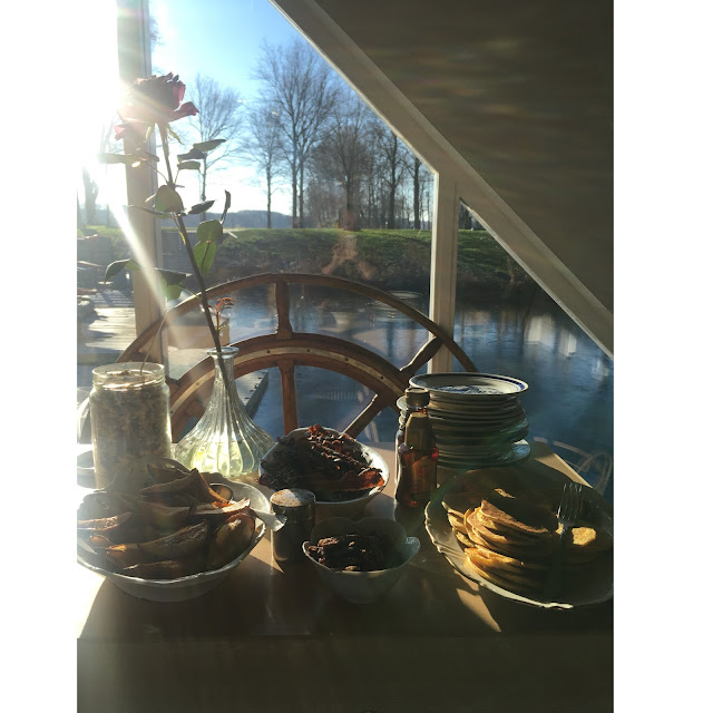 De eerste sessie in januari waren er pompoenpannenkoekjes met geroosterde peren, granola, labne. fritata, salade, lekker brood, kazen.